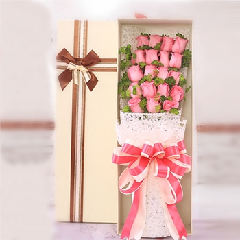 花材:19朵粉红色玫瑰,绿植搭配。 包装:粉色精美礼品纸,浅色礼品盒。 赠送:免费附送精美贺卡,代写您的祝福。 其它:由于花材的季节原因和手工包扎,可能在花束的形式和搭配上与图片不完全一致,但我们保证鲜花的主花材品种、新鲜程度、数量、颜色与说明一致,谢谢。