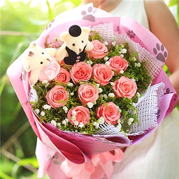 花材:11朵粉色玫瑰,黄英,满天星搭配。 包装:白色网编席内包,粉色硬纸外包,粉色蝴蝶结束花。 赠送:免费附送精美贺卡,代写您的祝福。 其它:由于花材的季节原因和手工包扎,可能在花束的形式和搭配上与图片不完全一致,但我们保证鲜花的主花材品种、新鲜程度、数量、颜色与说明一致,谢谢。