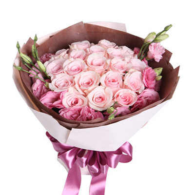 内层深咖啡平面牛油纸,外层浅粉色短平板,紫色缎带花结。